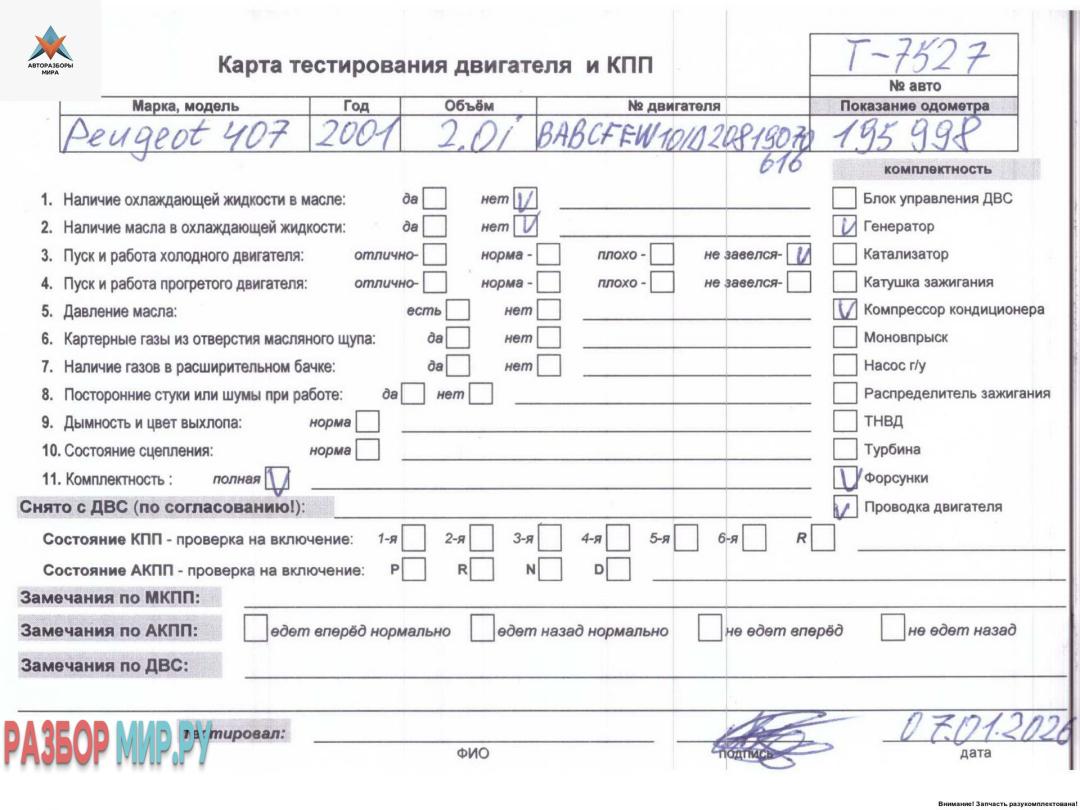 BABCF EW10/D 20819:070616 (цена без навесного), Внимание! Запчасть разукомплектована. Сняты запчасти: Стартер, КПП 5-ст. механическая, Генератор, Датчик абсолютного давления, Форсунка топливная, Компрессор кондиционера, Датчик положения распредвала, Форсунка топливная, Датчик положения коленвала, Форсунка топливная, Форсунка топливная, Заслонка дроссельная, Катушка зажигания, Трубка охлаждающей жидкости металлическая