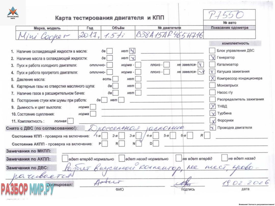 B38A15A F465H716 (цена без навесного), Внимание! Запчасть разукомплектована. Сняты запчасти: КПП 6-ст. механическая, Стартер
