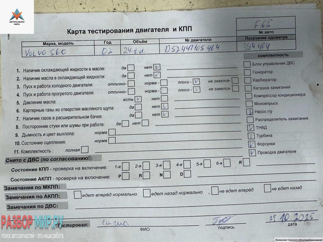D5244T 105464 (цена без навесного), Внимание! Запчасть разукомплектована. Сняты запчасти: КПП 5-ст. механическая, Компрессор кондиционера, Генератор, ТНВД, Насос вакуумный, Патрубок радиатора, Датчик положения коленвала, Клапан управления турбиной (актуатор), Форсунка топливная, Турбина, Кожух ГРМ, Патрубок интеркулера, Патрубок интеркулера, Форсунка топливная, Патрубок отопителя (печки), Форсунка топливная, Насос гидроусилителя руля, Патрубок турбины, Форсунка топливная, Рампа (рейка) топливная, Шланг гидр