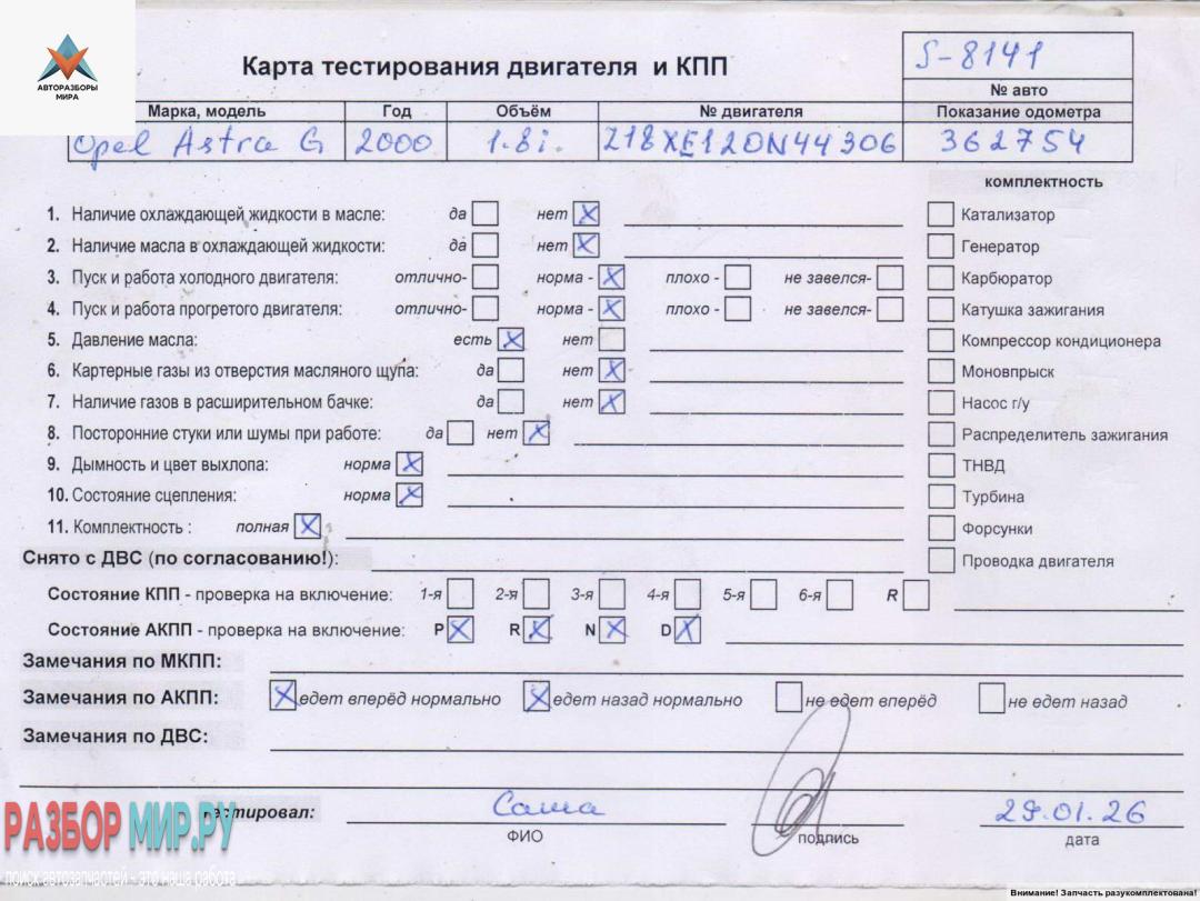 X18XE1 20N44306 (цена без навесного), Внимание! Запчасть разукомплектована. Сняты запчасти: Стартер, КПП автоматическая (АКПП)