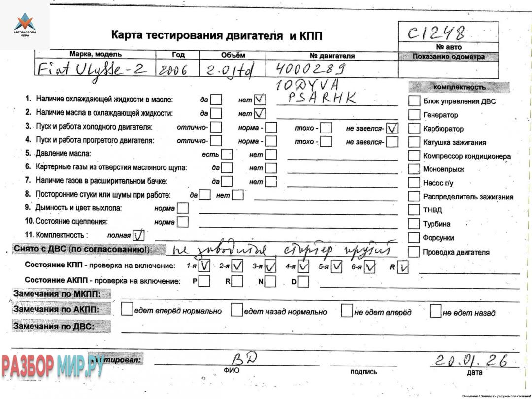 4000289 10DYNA PSA RHK (цена без навесного), Внимание! Запчасть разукомплектована. Сняты запчасти: Стартер, КПП 6-ст. механическая