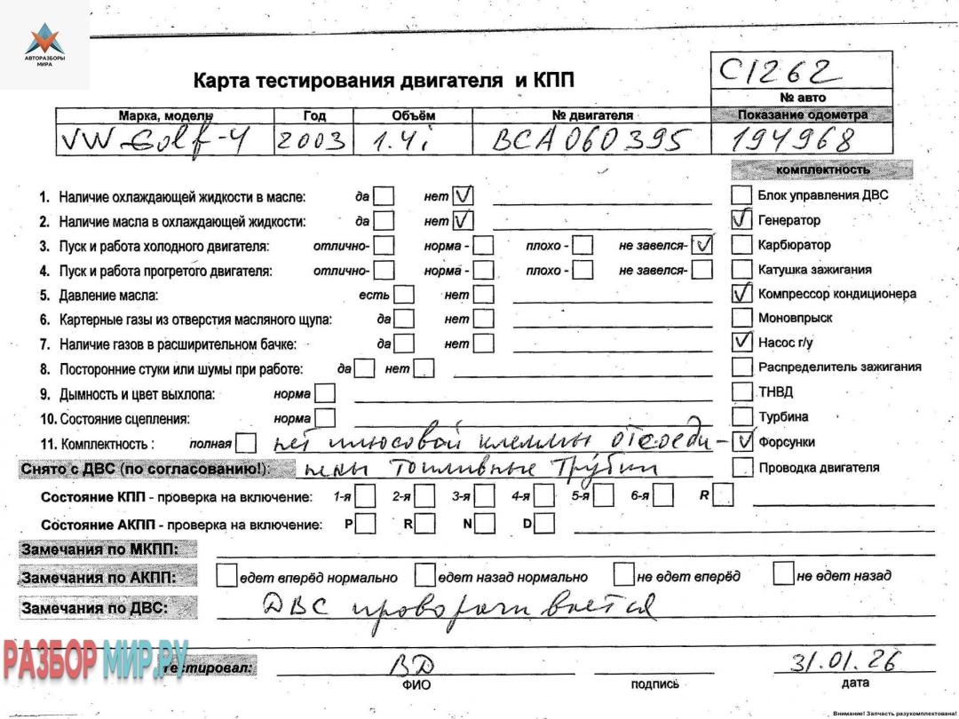 BCA 060395 (цена без навесного), Внимание! Запчасть разукомплектована. Сняты запчасти: КПП 5-ст. механическая, Стартер