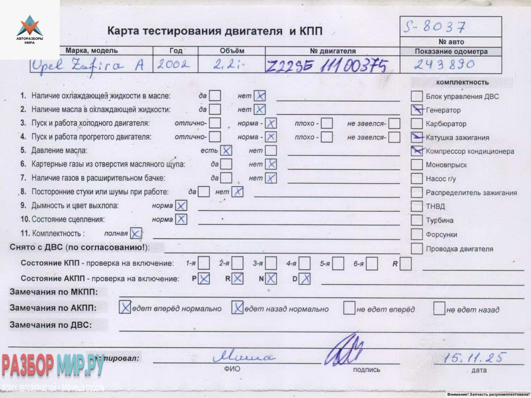Z22SE 11100375 (цена без навесного), Внимание! Запчасть разукомплектована. Сняты запчасти: Крышка масляного фильтра, Клапан EGR (рециркуляции выхлопных газов), Заслонка дроссельная, Коллектор выпускной, Катушка зажигания, Компрессор кондиционера, Генератор