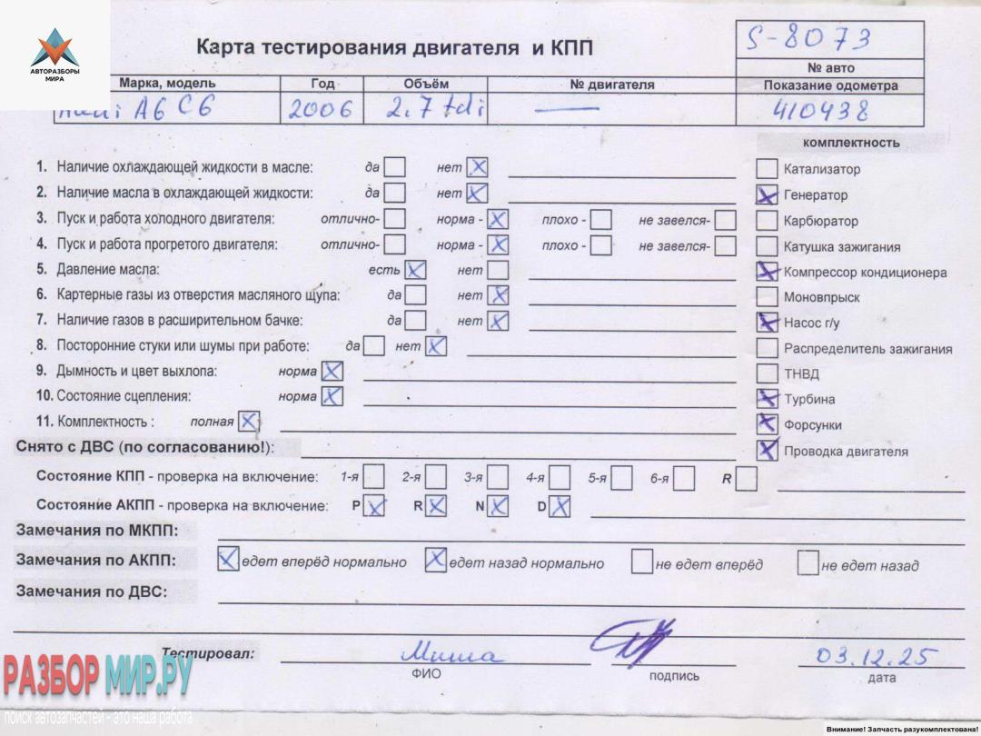 Б/Н (цена без навесного), Внимание! Запчасть разукомплектована. Сняты запчасти: Форсунка топливная, Форсунка топливная, Кронштейн ТНВД, Электропривод (моторчик сервопривода), Электропривод (моторчик сервопривода), Патрубок радиатора, Датчик положения коленвала, Трубка охлаждающей жидкости металлическая, Труба приемная глушителя, Генератор, ТНВД, Маховик, Форсунка топливная, Форсунка топливная, Форсунка топливная, Форсунка топливная, Механизм натяжения ремня, цепи, Патрубок радиатора, Шкив насоса гидроусилит