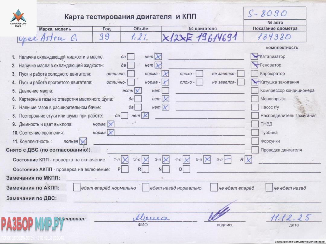 X12XE 19G14691 (цена без навесного) разбор по карточке, Внимание! Запчасть разукомплектована. Сняты запчасти:, Генератор, Катушка зажигания, Корпус масляного фильтра, Клапан EGR (рециркуляции выхлопных газов), Датчик положения распредвала, Датчик кислородный (лямбда-зонд), Кронштейн двигателя опорный, Коллектор впускной, Заслонка дроссельная, Механизм выбора передач, Механизм натяжения ремня, цепи