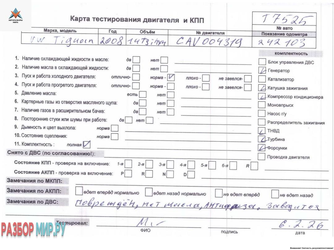 CAV 004319 (цена без навесного), пробит поддон, наличие дефекта, Внимание! Запчасть разукомплектована. Сняты запчасти: КПП 6-ст. механическая, Стартер, Форсунка топливная, Форсунка топливная, Форсунка топливная, Форсунка топливная, Трубка охлаждающей жидкости металлическая, Трубка масляная турбины, Генератор, Фланец (тройник) системы охлаждения, Компрессор кондиционера, Патрубок воздушного фильтра, Маховик, Патрубок интеркулера, Турбина, Патрубок интеркулера, Кронштейн компрессора кондиционера, Патрубок инт