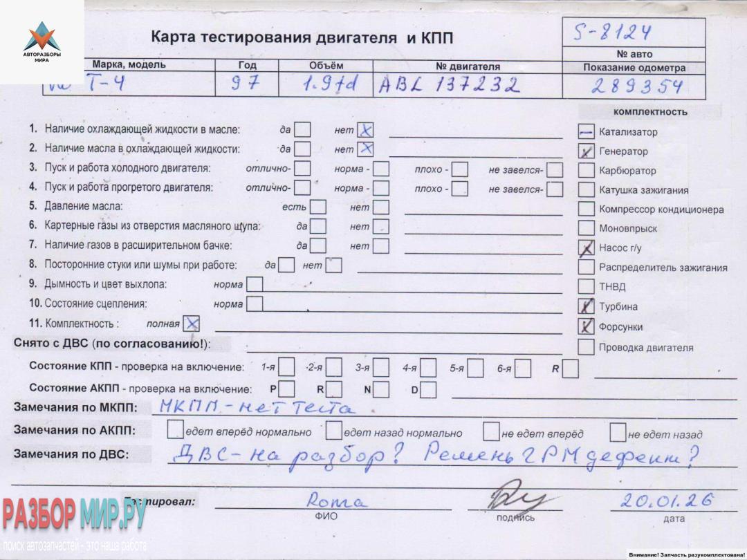 ABL 137232 (цена без навесного), Внимание! Запчасть разукомплектована. Сняты запчасти: Стартер, КПП 5-ст. механическая, Цилиндр сцепления рабочий, Трубка топливная, Форсунка топливная, Форсунка топливная, Форсунка топливная, Форсунка топливная, Трубка масляная турбины, Трубка цилиндра сцепления, Шланг гидроусилителя, Кожух ГРМ, Коллектор выпускной, Генератор, Маховик, ТНВД, Турбина, Насос гидроусилителя руля, Подушка крепления двигателя, Насос вакуумный, Шкив коленвала, Шкив помпы, Шкив насоса гидроусилител