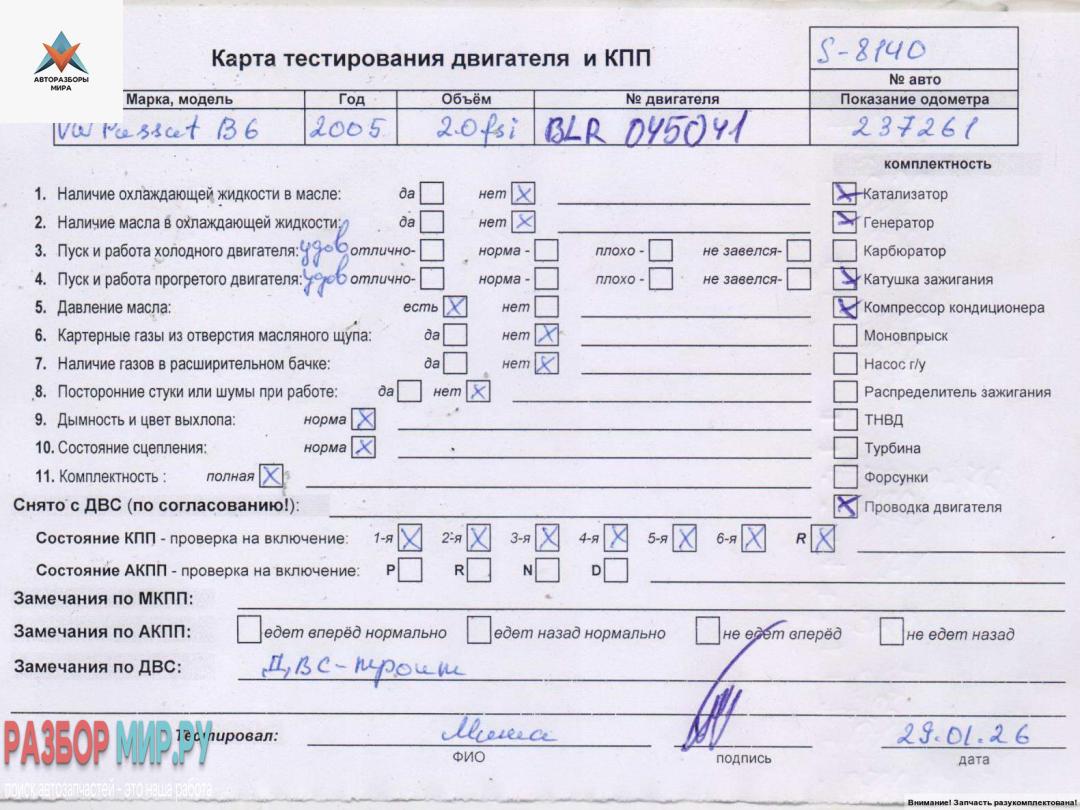 BLR 045041 (цена без навесного), Внимание! Запчасть разукомплектована. Сняты запчасти: КПП 6-ст. механическая, Стартер